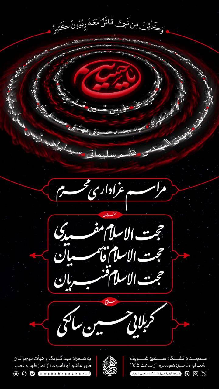 مراسم عزاداری سید و سالار شهیدان(ع)، اول تا سیزدهم محرم الحرام (16 الی ۲۸ تیرماه 1403) از ساعت ۱۹:۱۵ و با سخنرانی حجت‌الاسلام مفیدی (۵ شب اول)، حجت‌الاسلام قاسمیان (۵ شب دوم و ظهر تاسوعا و عاشورا) و حجت‌الاسلام قنبریان (۳ شب آخر) در مسجد دانشگاه صنعتی شریف برگزار خواهد شد.